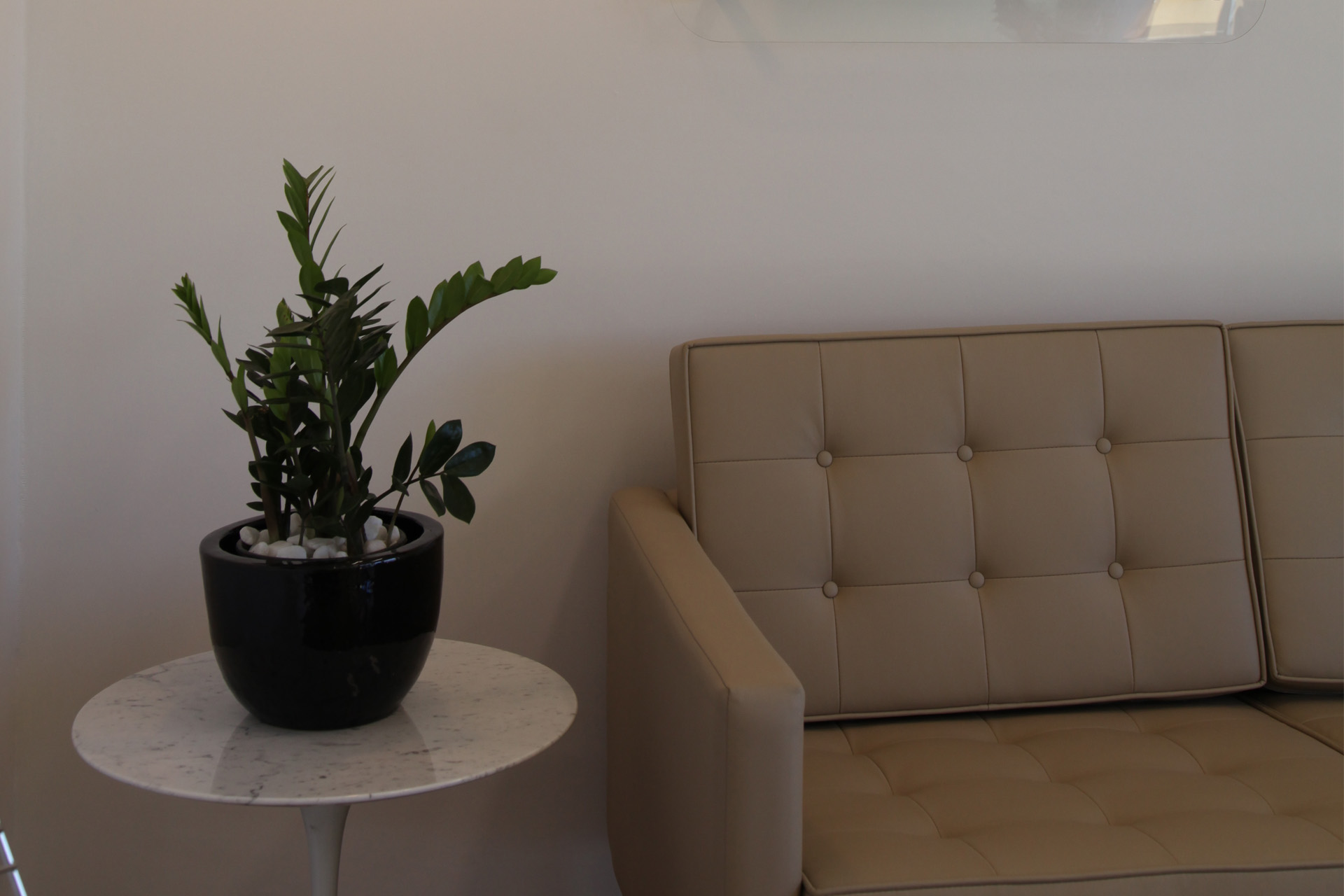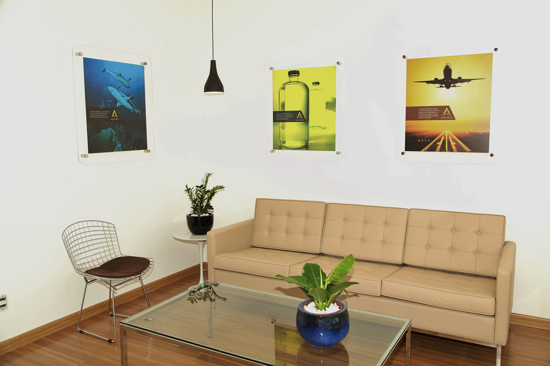 O projeto introduziu novos mobiliários, como sofá, poltrona, mesa de centro e cadeiras de design contemporâneo, além de plantas naturais que trazem vida ao ambiente. A composição foi complementada com quadros temáticos e iluminação pontual, criando uma atmosfera moderna e agradável para recepção de visitantes e colaboradores.